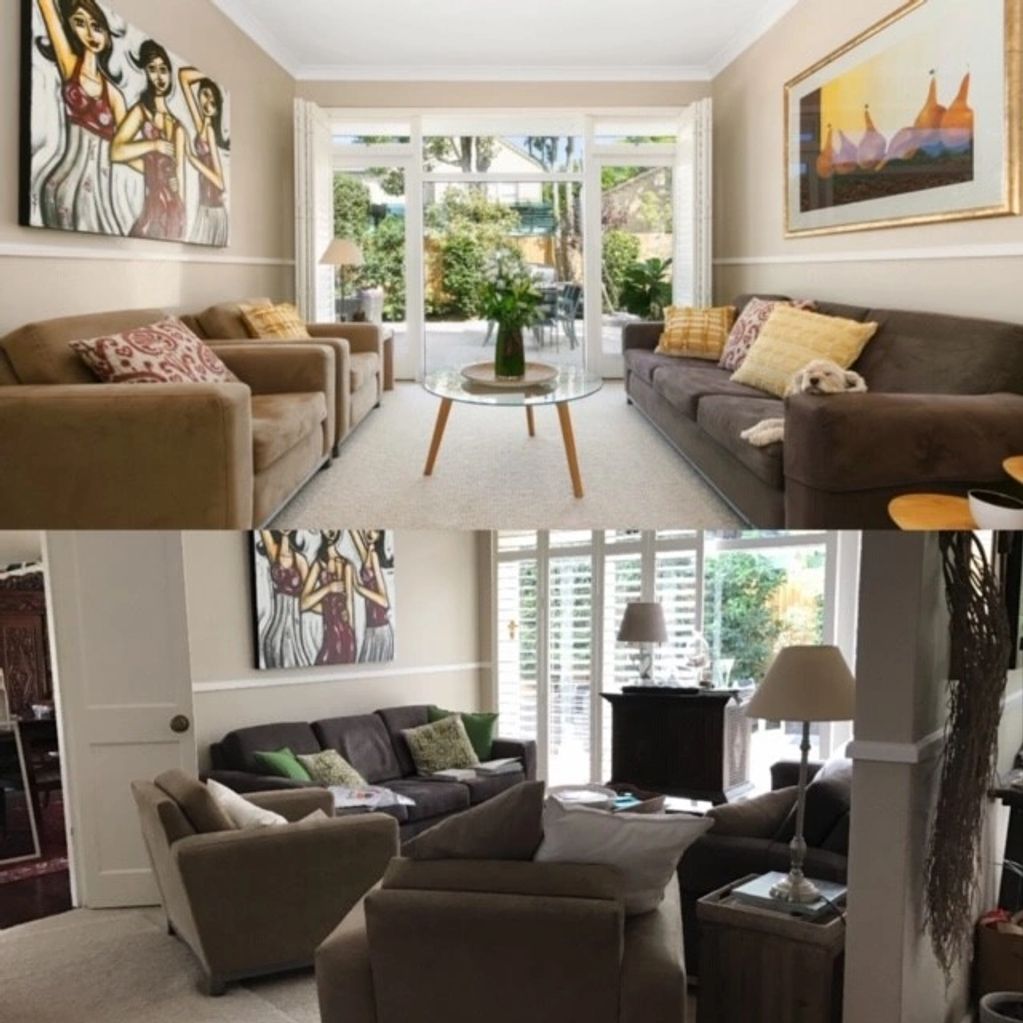 Living room before and after with some small alterations, new paint and refurbished sofas.