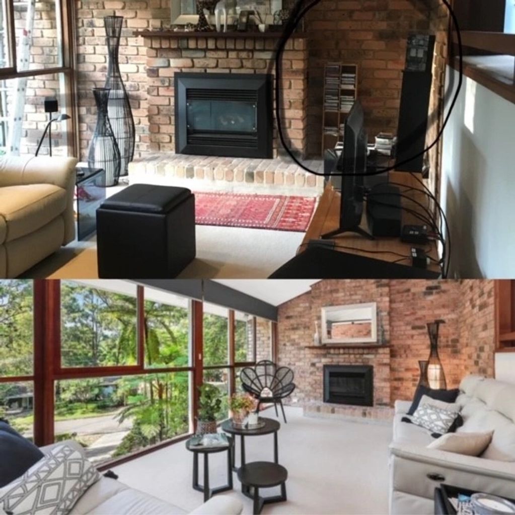 Before and after of living room. Less furniture and clutter creates an airy open space with a sophistidated look.